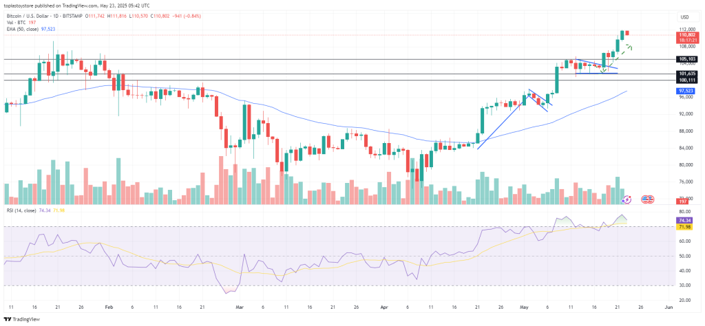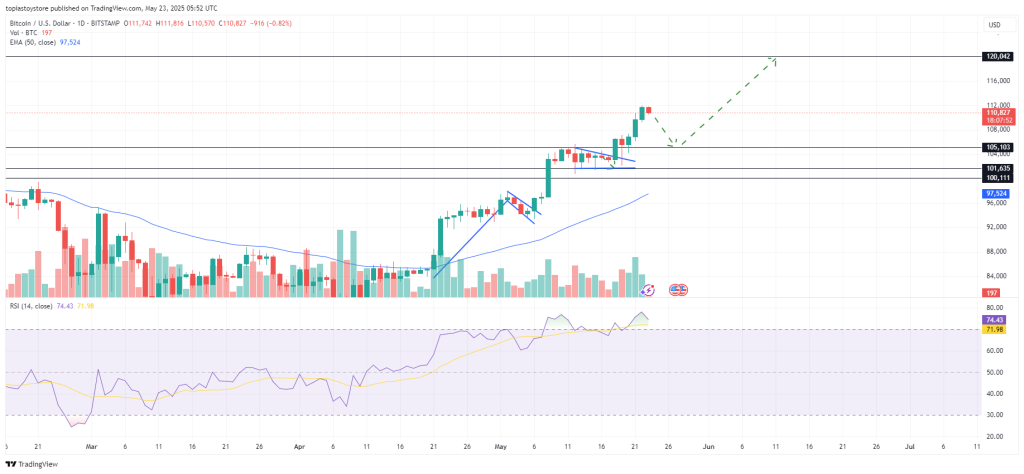 Onze verwachting is een Pullback naar support rond de 105K. De RSI is ook groter dan 70 wat mogelijk duidt op een omkeer in prijs. Wanneer Bitcoin de 105K grens opzoekt zou dit een mooi instap moment zijn naar de volgende stap hoger.