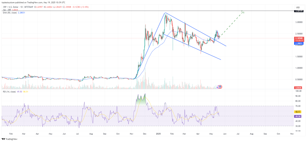 Op de 3-daagse grafiek is een klassiek bull flag patroon zichtbaar. Dit patroon verschijnt vaak tijdens consolidatiefases in een stijgende markt en wijst op een mogelijke voortzetting van de trend. Als XRP door de weerstandszone rond $2,65 breekt, verwachten wij een koersdoel rond $3,5. Dat is ruim 50% boven de huidige koers! ๐ฐ